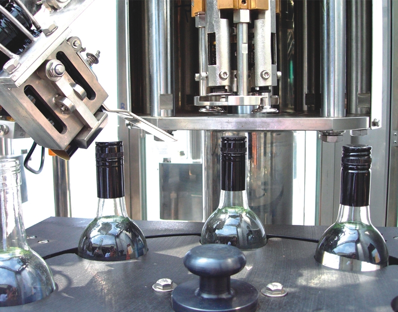 La máquina permite tanto el llenado, la inserción del tapón de corcho como la colocación de la cápsula de aluminio tres funciones en una sola máquina. también es posible elegir insertar solo el tapón de corcho o sellar un tapón de aluminio. Este sistema utiliza el llenado por gravedad. El nivel de llenado depende de la posición del orificio de ventilación y se puede controlar ajustando la altura de los sellos.